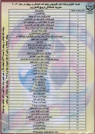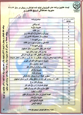 قابل توجه کشاورزان محترم به اطلاع می رساند لیست عناوین و برنامه های آموزشی شهرستان به شرح ذیل می باشد با مراجعه به اداره ترویج شهرستان هریک از موارد آموزشی مورد نیاز به شما ارائه می گردد.